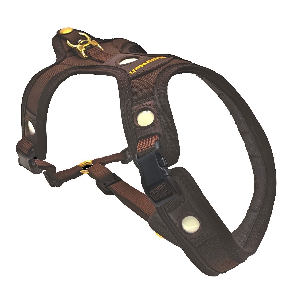 Das Geschirr basiert auf derselben bewährten Follow-Konstruktion: Schlittenhunde-Prinzip für ideale anatomische Passform, 3 Steckverschlüsse für blitzschnelles Anlegen, verstellbarer Bauchgurt, hochwertige Büffelleder-Applikationen mit Sattelleder und Messing-Drehwirbel an der Oberseite (Gr. XS–M). Gr. XXS hat einen Messing-D-Ring. Für Gr. XS, S und M passen nur Leinen mit max. 15 mm Breite.