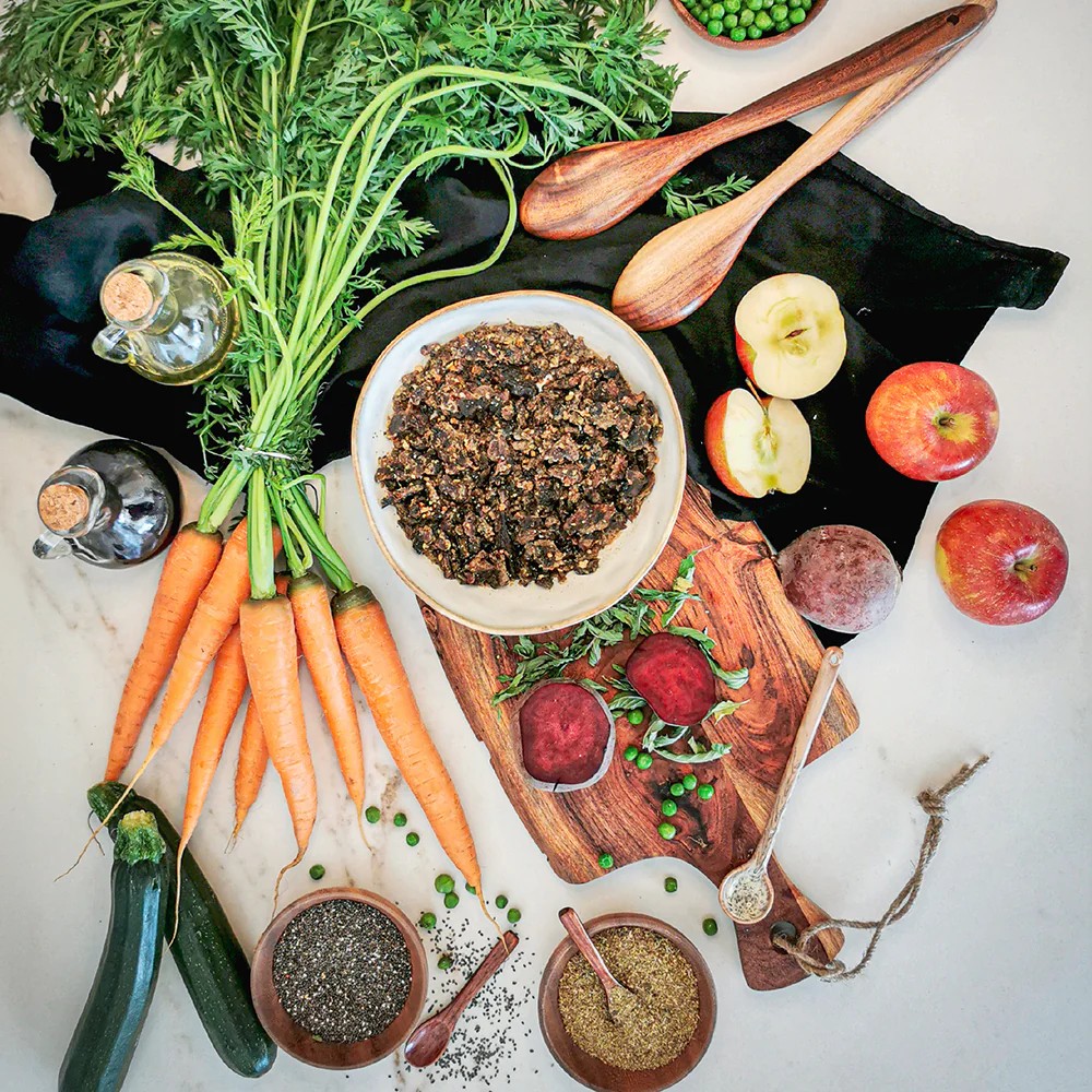 20 % getrocknetes Gemüse und Obst: Zucchini, Sellerie, Erbsen, Pastinaken, Luzerne, Rote Beete, Apfel, Spinatblätter, Karotten, Holunderbeeren, Weißdornbeeren, Kokos und Löwenzahn